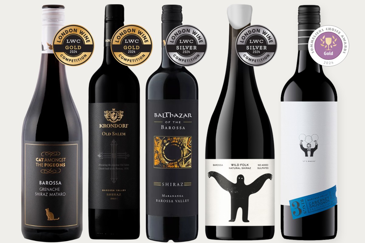 Image: Winners from the Barossa Region - (L-R) 2024 London Wine Competition Winners: Cat Amongst The Pigeons Barossa Grenache Shiraz Mataro 2022, Krondorf Old Salem Barossa Shiraz 2021, Balthazar Of The Barossa Marananga Barossa Valley Shiraz 2021, Wild Folk Barossa Shiraz 2023 & 2024 Sommeliers Choice Award Winner: 3 Rings Barossa Valley Cabernet Sauvignon 2022.